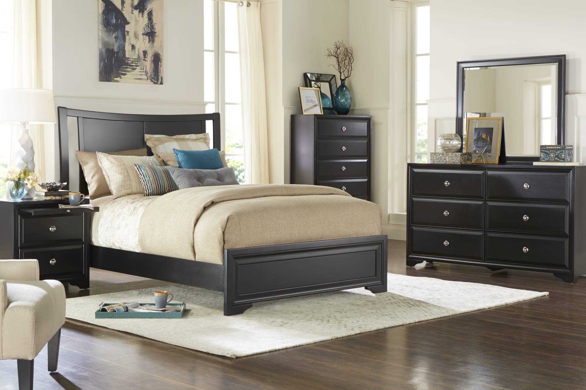 Update your bedroom with the stylish the Belcourt collection. This contemporary suite is crafted of birch veneers in a classic black finish. The bed features a graceful sleigh headboard balanced by a low footboard boasting picture frame molding. The matching dresser includes both round and bar-shaped hardware in brushed chrome. Mattress and foundation (if required) sold separately.