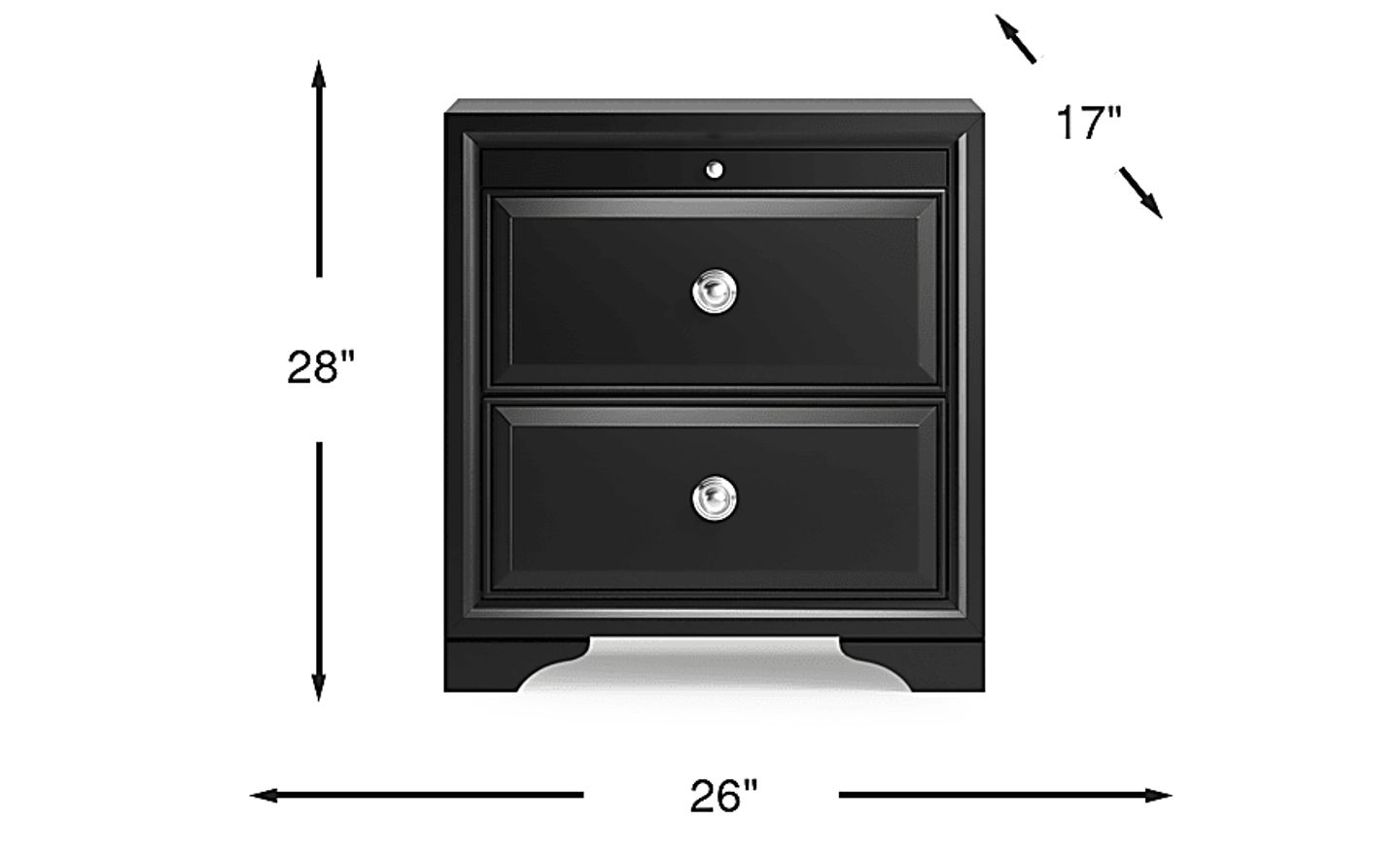 Gain bedside storage while retaining a look of simplicity when you choose the Belcourt nightstand. Roomy twin drawers, crafted using sturdy French and English dovetailing, are accompanied by a handy pull out tray. Brushed chrome pulls contrast beautifully with the black finish. To give the nightstand your personal touch, it comes with two hardware styles: round or bar shaped pulls. You choose the look!