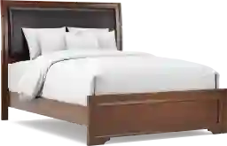 Boost your bedroom decor with the stylish Belcourt bed. The headboard's dark brown upholstery is carefully finished with stitching detail while the classic sleigh style adds a graceful silhouette. The low footboard boasts picture frame molding. Crafted with birch veneers, the bed has a rich cherry finish. Mattress and foundation (if required) sold separately.