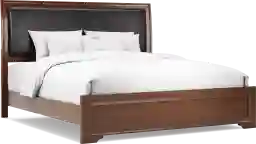Boost your bedroom decor with the stylish Belcourt bed. The headboard's dark brown upholstery is carefully finished with stitching detail while the classic sleigh style adds a graceful silhouette. The low footboard boasts picture frame molding. Crafted with birch veneers, the bed has a rich cherry finish. Mattress and foundation (if required) sold separately. Bed shown is queen size.