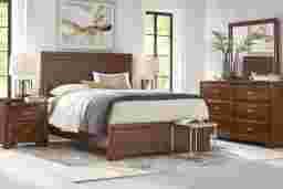 Create a stylish bedroom retreat you'll love coming home to when you select the Belcourt collection. This contemporary suite is crafted of birch veneers in a rich cherry finish. The panel bed and matching pieces feature straight lines creating a clean, contemporary aesthetic. Matching pieces with drawers include both round and bar-shaped hardware in brushed chrome. Mattress and foundation (if required) sold separately. Bed shown is queen size.