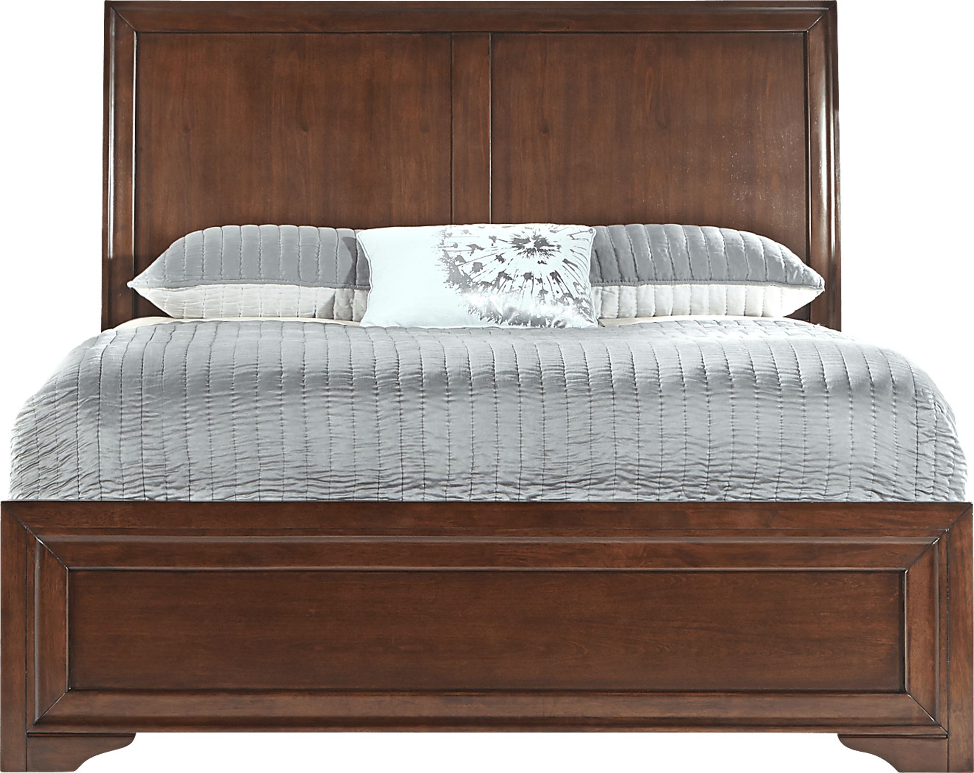 Transform your bedroom decor with the stylish Belcourt bed. The charming sleigh headboard provides a graceful silhouette while the low panel footboard features classic picture frame molding. Crafted with wood solids and birch veneers the bed has a rich cherry finish. Mattress and foundation (if required) sold separately.