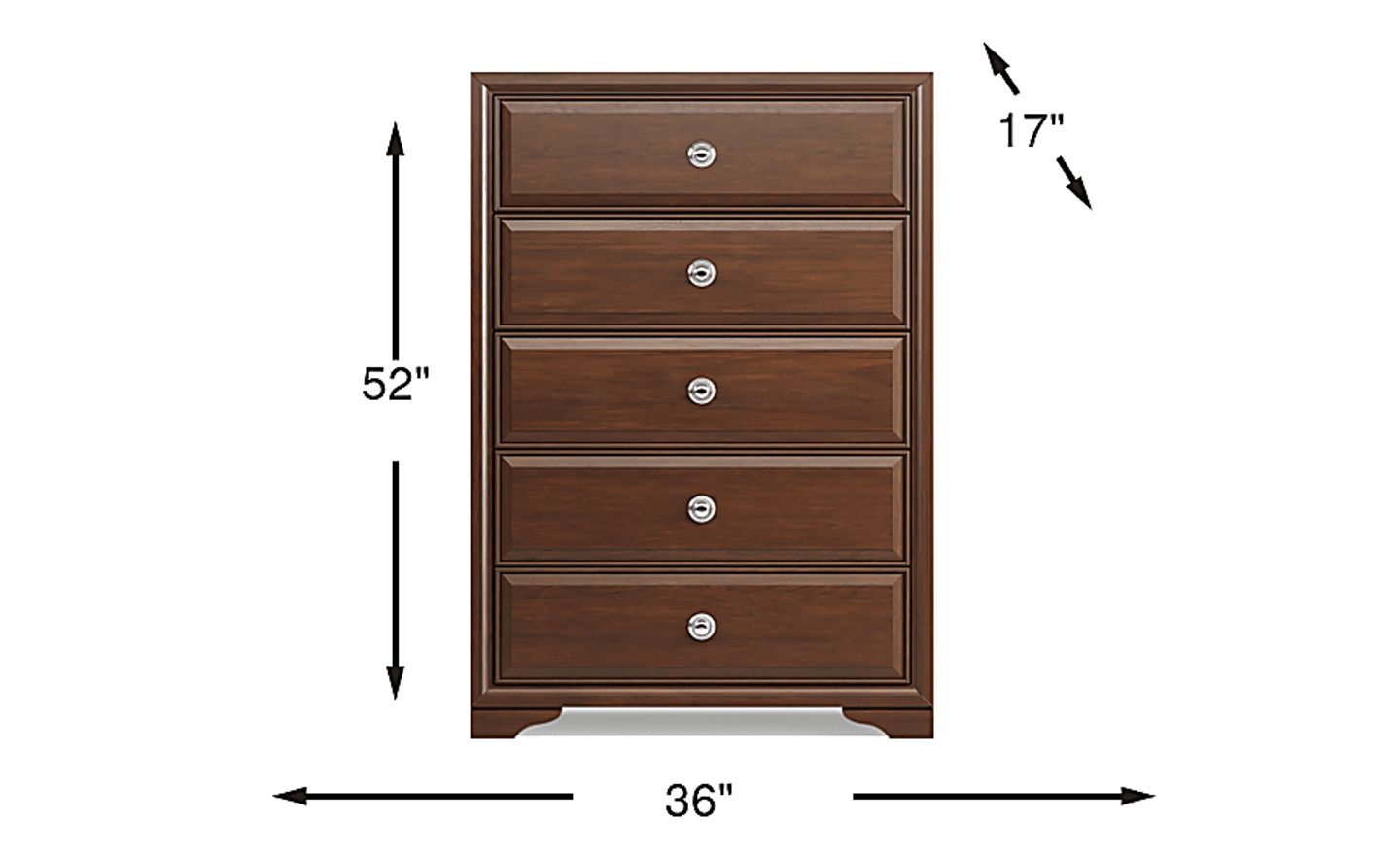 Increase the storage in your bedroom while maintaining a clean contemporary look when you add the Belcourt chest. This piece features straight lines and five deep drawers perfect for folded clothing. Each drawer is made using French and English dovetailing for strength and stability. The dresser's cherry finish is contrasted by brushed chrome hardware in your choice of round or bar shaped pulls (both are included).
