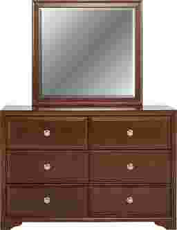 For simplicity with sleek style - and plenty of storage - choose the Belcourt dresser and mirror set. Contemporary styling is achieved with clean lines and straightforward design. Six roomy drawers in the dresser are constructed using French and English dovetailing for strength and stability. Top drawers are lined in felt to buffer delicate items such as jewelry and other small accessories. The dresser and mirror's cherry finish is contrasted by brushed chrome hardware in your choice of round or bar shaped pulls (both are included).