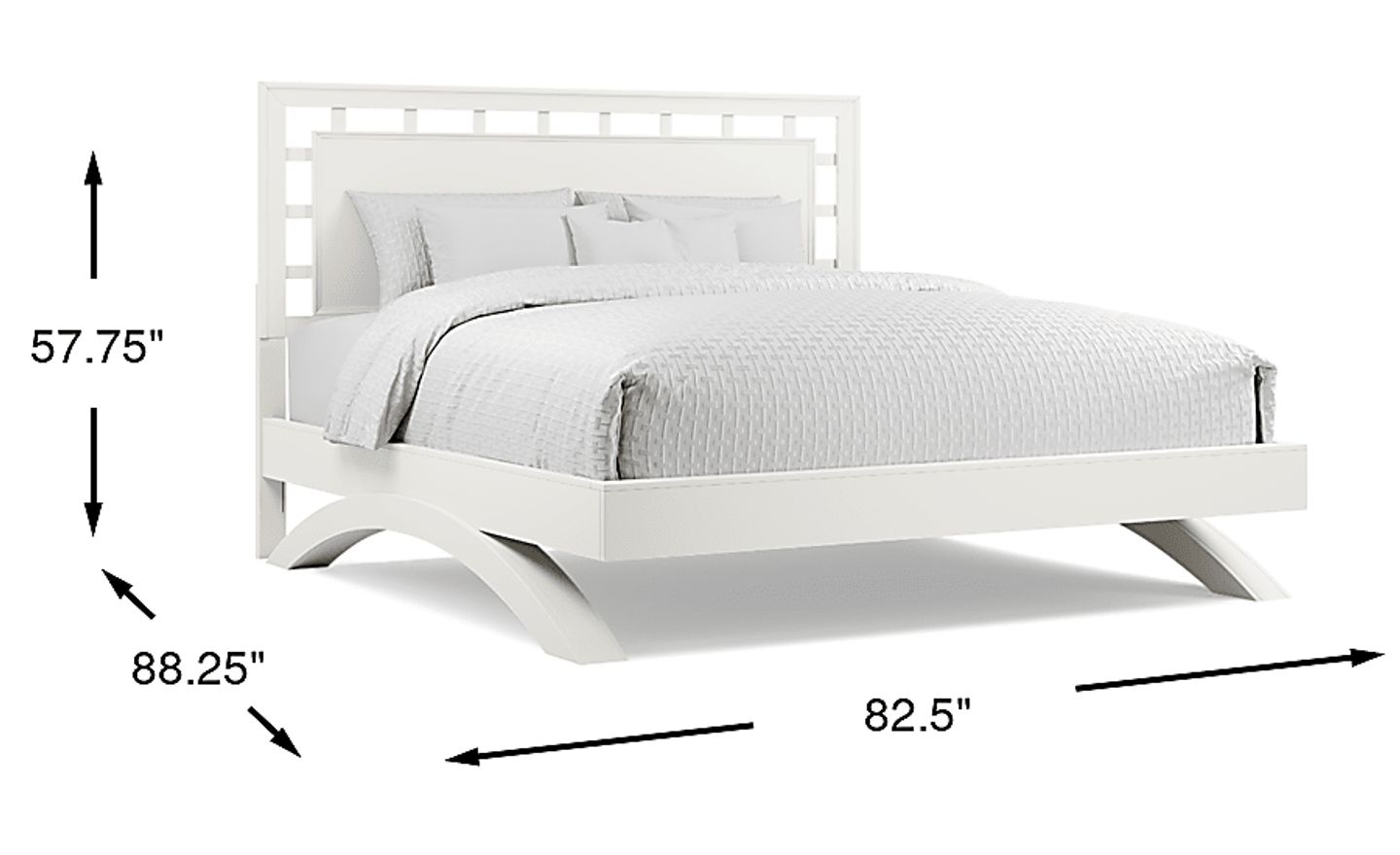 The sleek Belcourt bed is perfect for those who appreciate contemporary design. Rich in visual appeal, it has a lattice style headboard and dramatic arched base for a clean, open look. The design is completed with a fresh white finish. This bed requires a mattress only, no boxspring is needed. Mattress and foundation (if required) sold separately. Bed shown is queen size. Bed board required for mattress support.