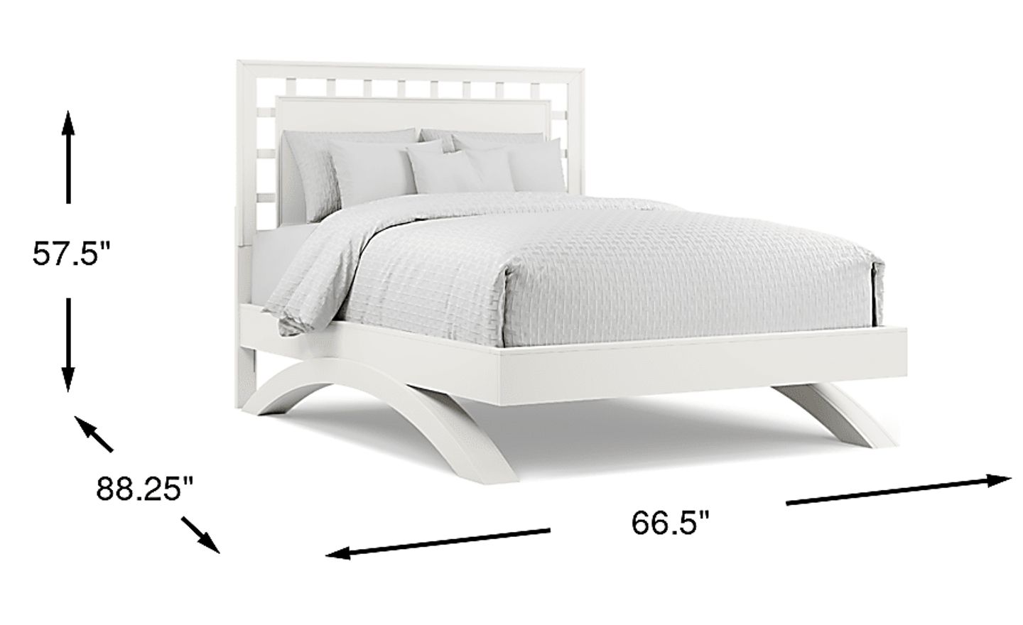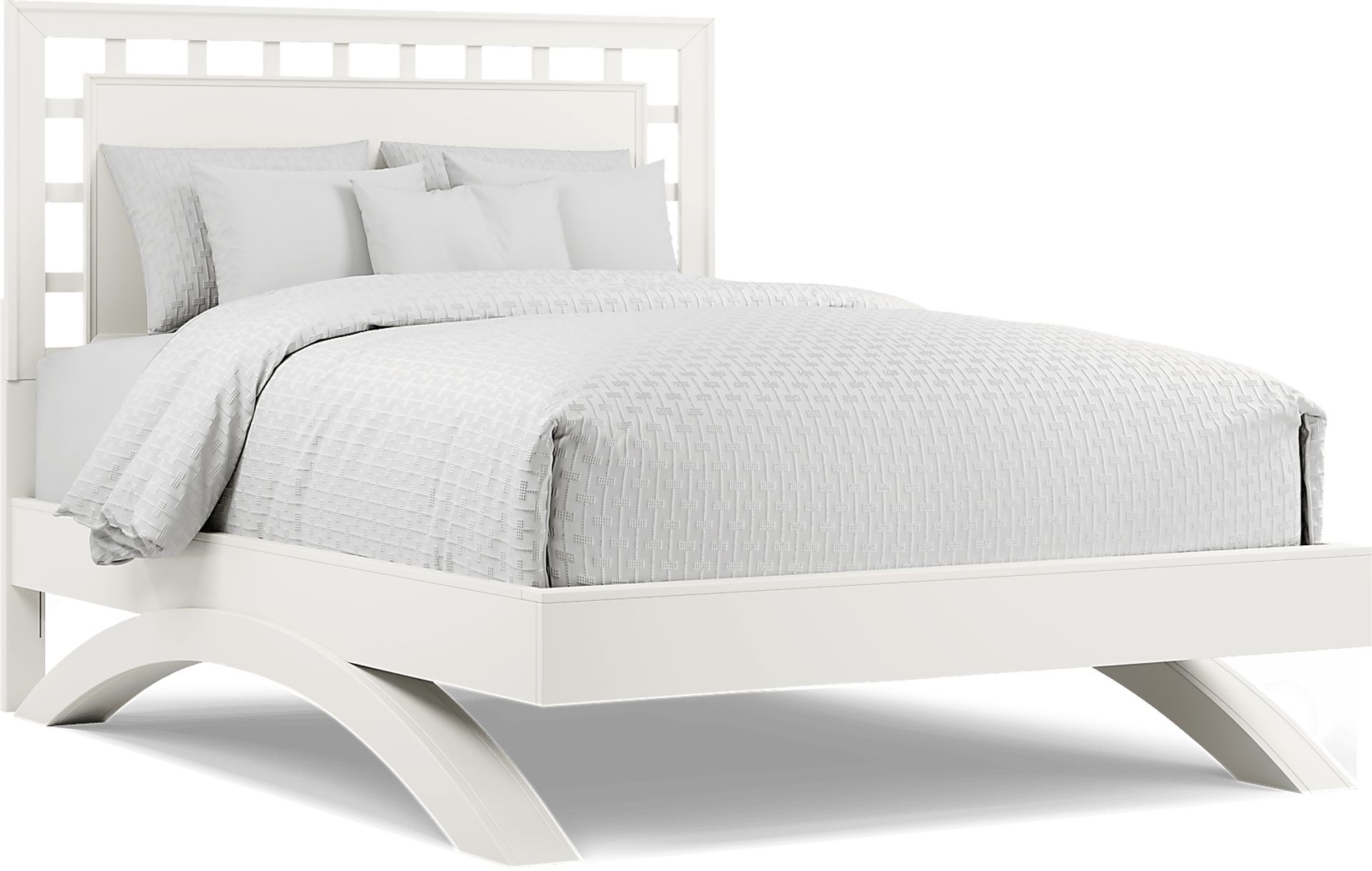 The sleek Belcourt bed is perfect for those who appreciate contemporary design. Rich in visual appeal, it has a lattice style headboard and dramatic arched base for a clean, open look. The design is completed with a fresh white finish. This bed requires a mattress only, no boxspring is needed. Mattress and foundation (if required) sold separately. Bed board required for mattress support.
