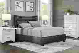 Create a bedroom retreat you'll love coming home to when you select the Belcourt collection with the Genoa upholstered bed. Strikingly stylish with a handsome contemporary design, the Genoa bed is the perfect focal point for your bedroom. Upholstered in smooth black fabric, this stylish bed features a reverse arched headboard accented with chic silver finished nailhead trim. Matching pieces with drawers include both round and bar-shaped hardware in brushed chrome. This contemporary suite is crafted of birch veneers in a stunning white finish. Mattress and foundation (if required) sold separately.