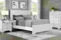 Create a stylish bedroom retreat you'll love coming home to when you select the Belcourt collection. Especially suited for bedrooms in smaller spaces like condos and apartments, this contemporary suite is crafted of birch veneers in a classic white finish. The panel bed and matching chest and nightstand feature straight lines creating a clean, contemporary aesthetic. Matching pieces with drawers include both round and bar-shaped hardware in brushed chrome. Mattress and foundation (if required) sold separately.
