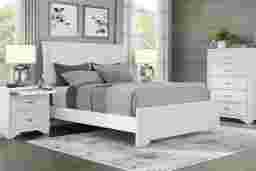Create a stylish bedroom retreat you'll love coming home to when you select the Belcourt collection. This contemporary suite is crafted of birch veneers in a white finish. The bed features an upholstered sleigh headboard balanced by a low footboard boasting picture frame molding. Thoughtful features include stitching details on the headboard's fabric and a choice of round or bar-shaped hardware in brushed chrome, both included. Mattress and foundation (if required) sold separately.