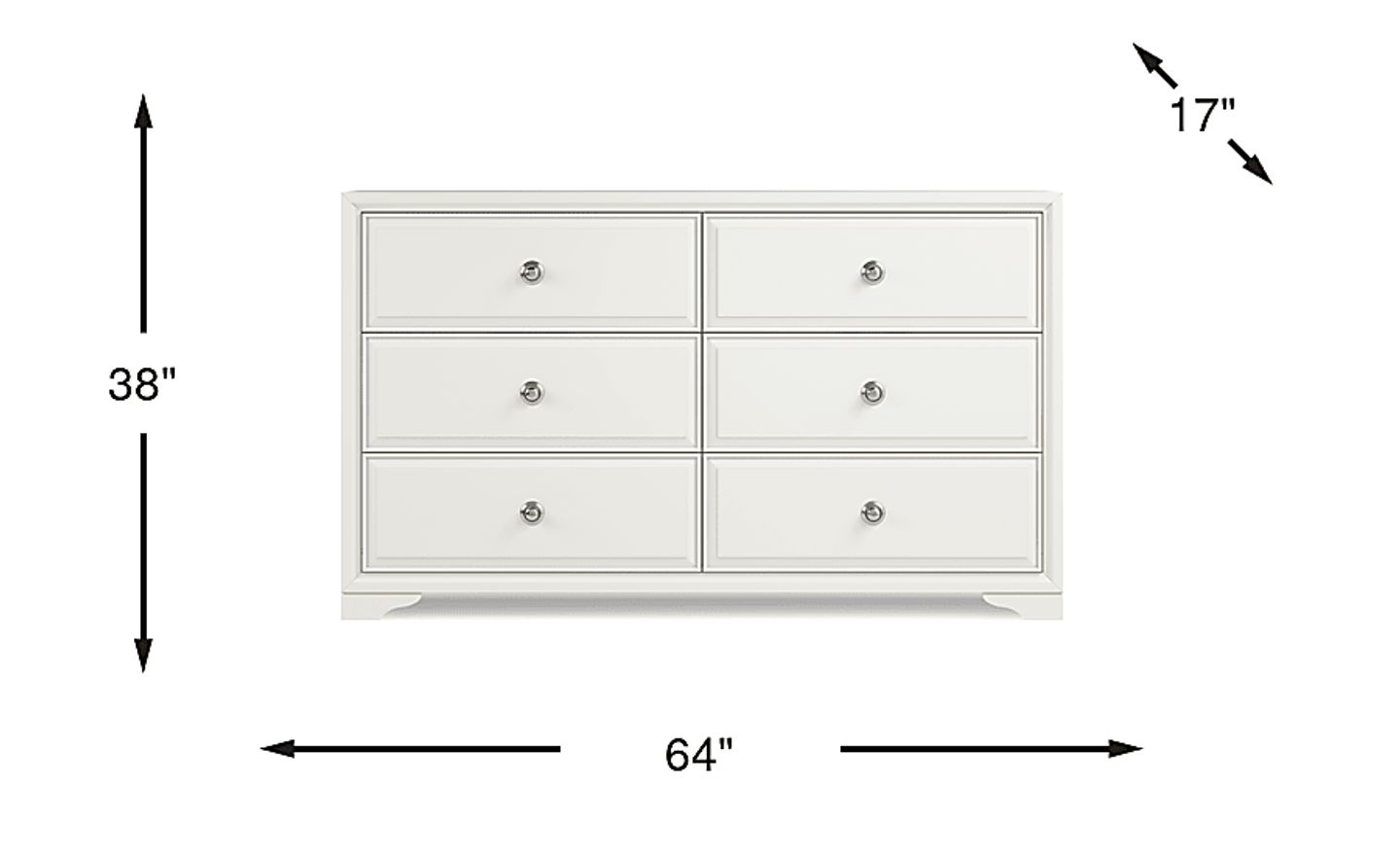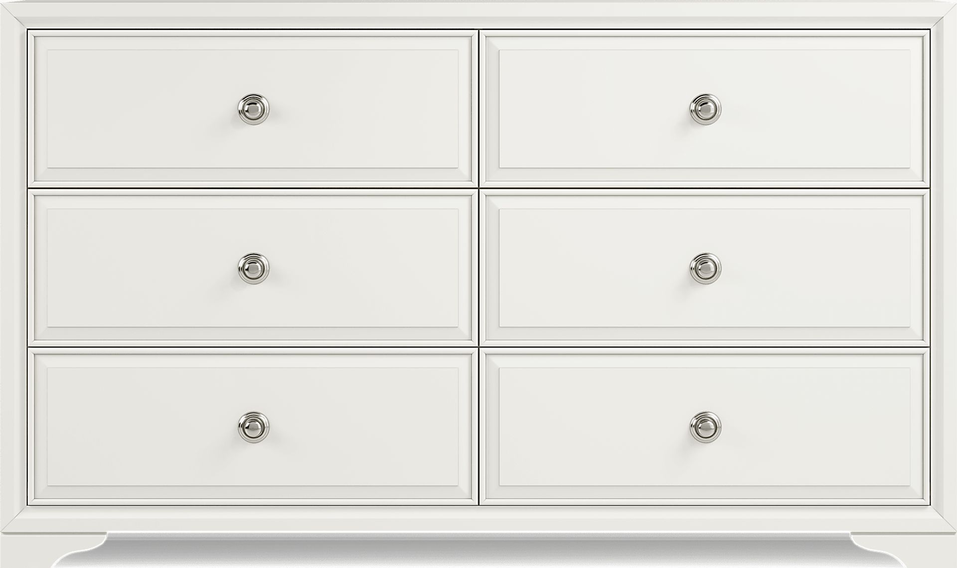 For simplicity with sleek style - and plenty of storage - choose the Belcourt dresser. Contemporary styling is achieved with clean lines and straightforward design. Six roomy drawers are constructed using French and English dovetailing for strength and stability. Top drawers are lined in felt to buffer delicate items such as jewelry and other small accessories. The dresser's painted white finish is contrasted by brushed chrome hardware in your choice of round or bar shaped pulls (both are included).