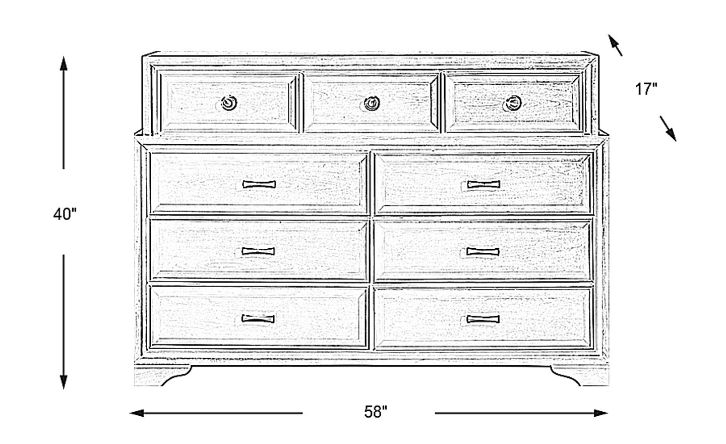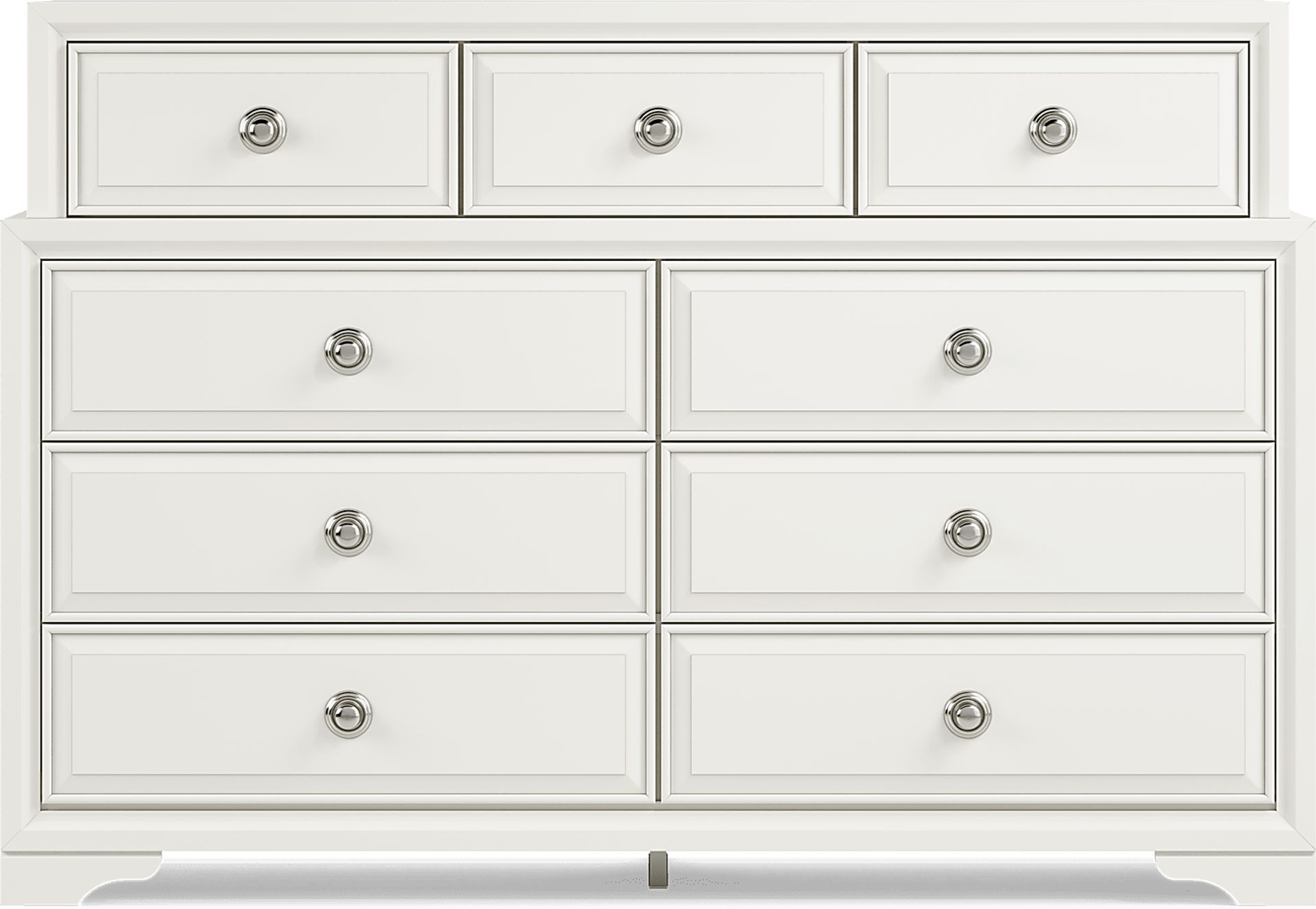 Abundant storage makes the Belcourt gallery dresser a bedroom essential. Contemporary styling is achieved with clean lines and straightforward design. Nine roomy drawers are constructed using French and English dovetailing for strength and stability. Top drawers are lined in felt to buffer delicate items such as jewelry and other small accessories. The dresser's white finish is contrasted by brushed chrome hardware in your choice of round or bar shaped pulls (both are included).