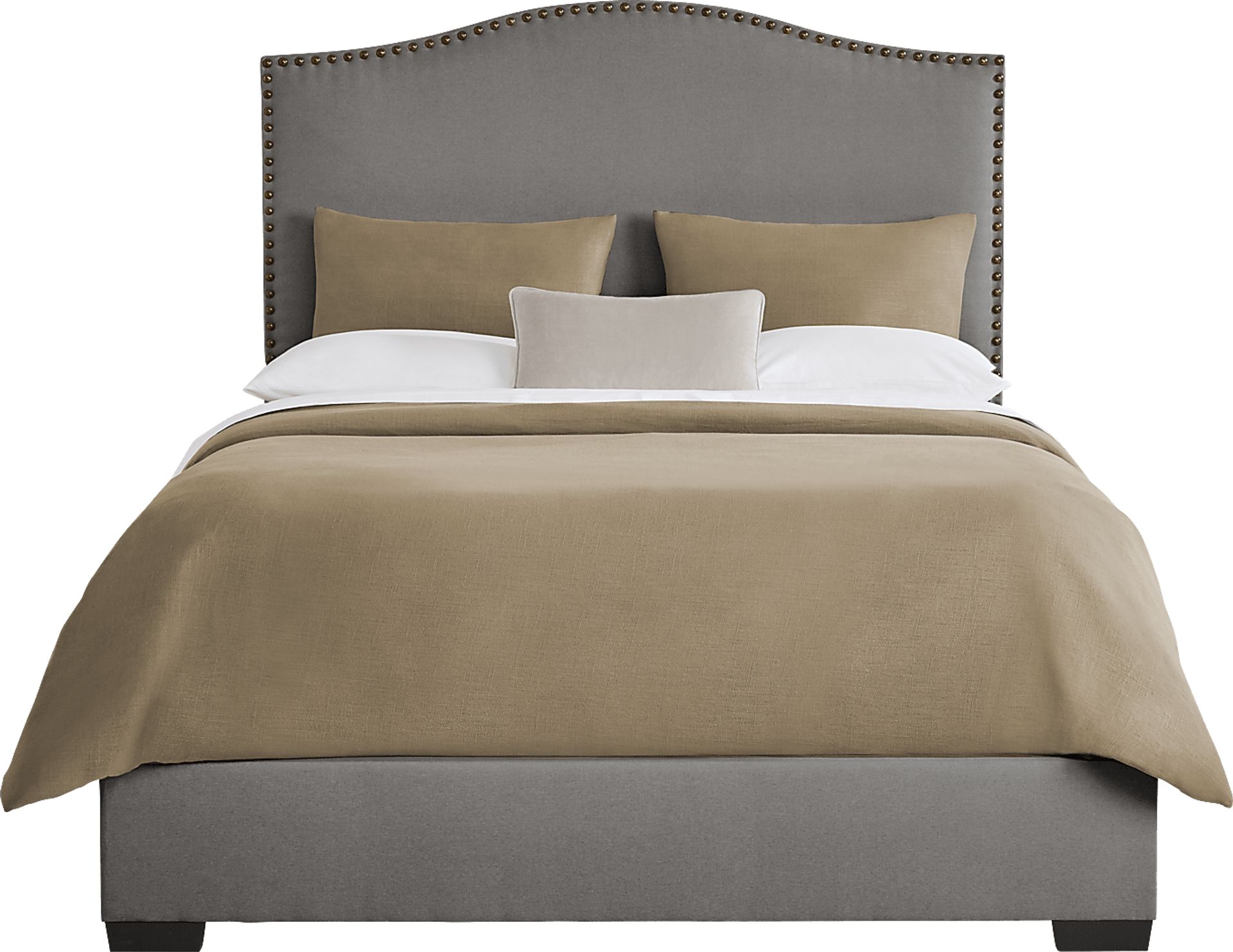 This bed is constructed to blend traditional craftsmanship with modern durability. The frame is supported by sturdy tapered legs that provide a stable foundation, while the headboard is upholstered in a high-quality, linen-style polyester fabric known for its resilience and resistance to wear. The hand-applied nailhead trim is not only a classic design feature but also serves to securely anchor the fabric edges, ensuring the upholstery stays taut and beautiful over years of use.