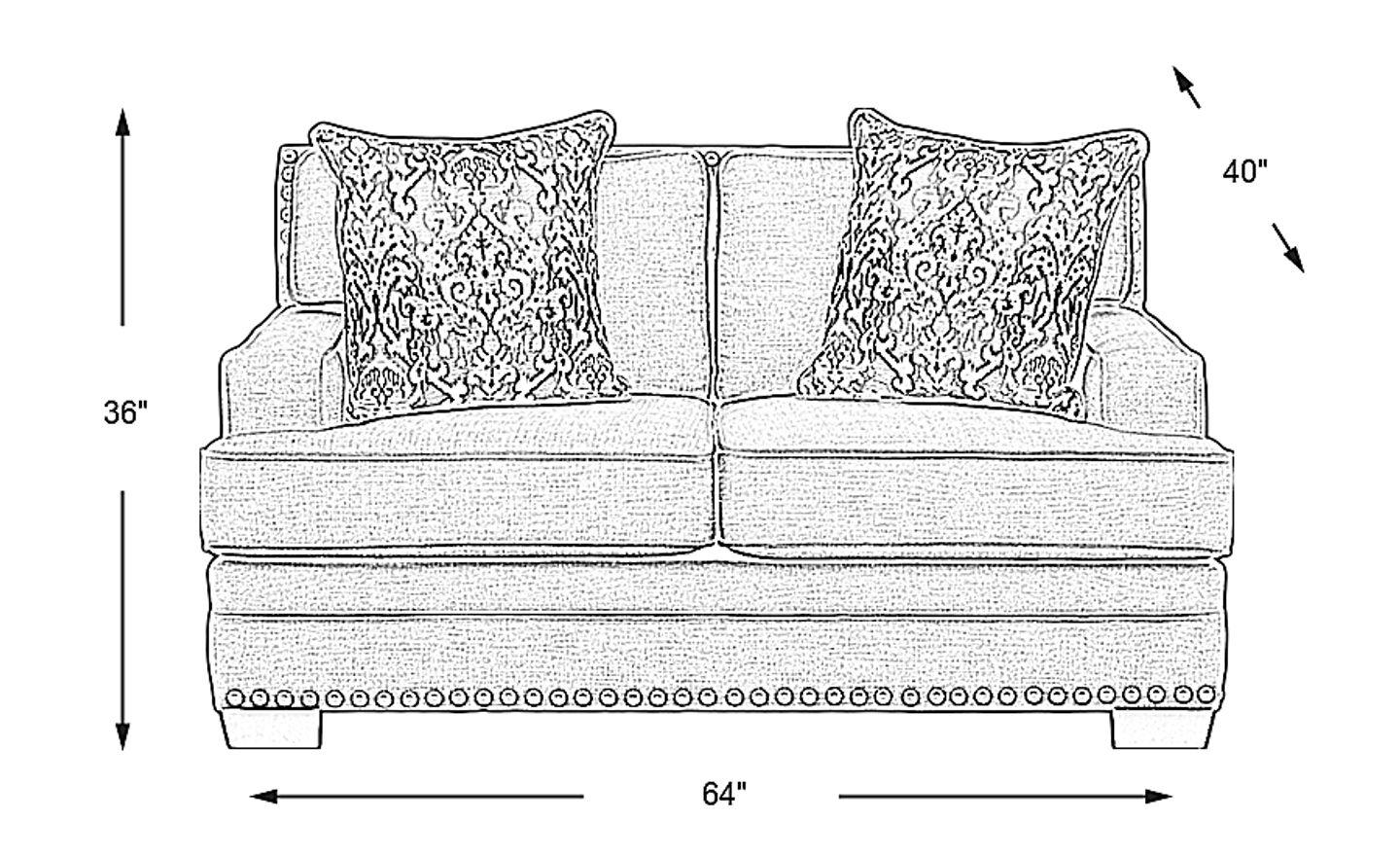 Full of sleek style, the Belhaven loveseat is an elegant spot for two. Upholstered in beige chenille fabric, this piece is easy to sink into. It features reversible seat and back cushions for convenience and padded arms for extra comfort. Pyramid style legs in a dark brown finish and a nailhead border add beautiful detail. Designer accent pillows with a damask pattern and solid colored backs are included. 100% Polyester
