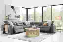 With a soothing, refined design and luxuriously soft textures, relaxation becomes an art form in the Belia dual power living room. The centerpiece of this modern collection is a gray dual power reclining sectional. Sleek tufted track arms and seat backs catch the eye, while subtle top-stitching details add fascinating character to the soft knitted upholstery. The reclining functionality includes dual power adjustable headrests and footrests, as well as USB charging on each control panel. Upholstery: 100% Polyester. Cleaning Instructions: Use water based cleaning agents or foam.