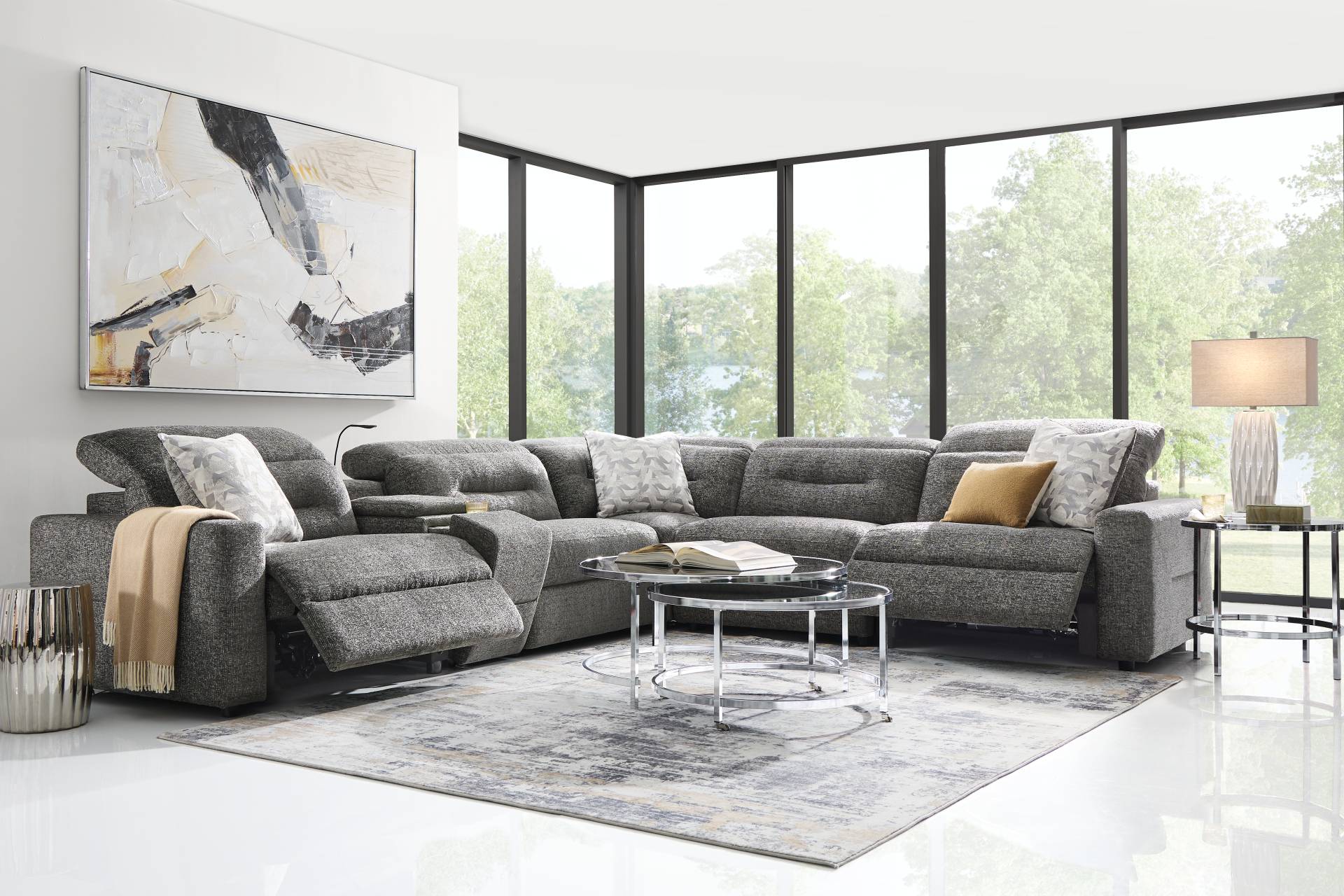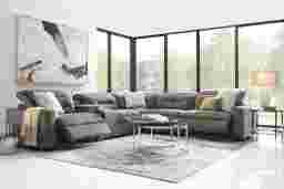 With a soothing, refined design and luxuriously soft textures, relaxation becomes an art form in the Belia dual power living room. The centerpiece of this modern collection is a gray dual power reclining sectional. Sleek tufted track arms and seat backs catch the eye, while subtle top-stitching details add fascinating character to the soft knitted upholstery. The reclining functionality includes dual power adjustable headrests and footrests, as well as USB charging on each control panel and a console that sports USB charging and hidden cupholders and storage. Upholstery: 100% Polyester. Cleaning Instructions: Use water based cleaning agents or foam.