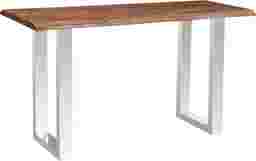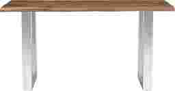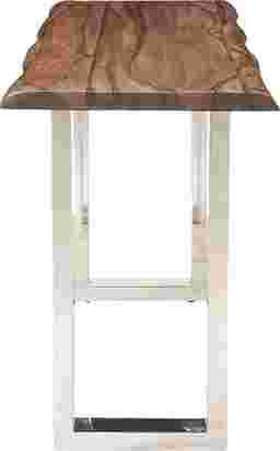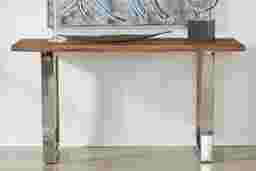 Featuring a warm, transitional wooden design element and luxurious chrome-finished u-shaped legs is the Bellac Point sofa table. Crafted of sheesham wood solids in a brownstone finish, this table's rustic feel delivers a striking yet comfortable and altogether appealing addition to your living space.