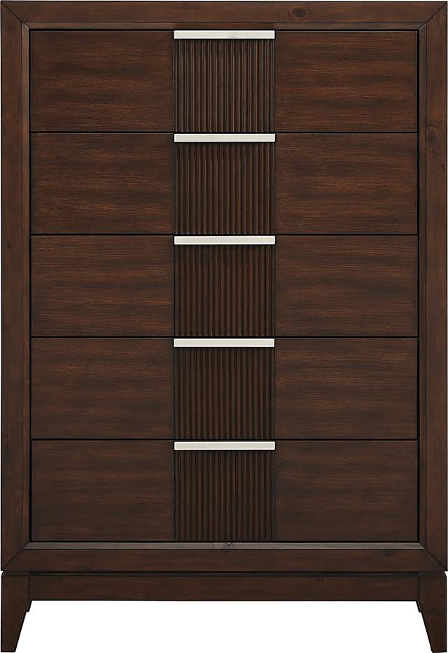 Expand storage options with the useful Bellante chest. Five vertically arranged drawers consolidate space without sacrificing space to keep your belongings. This piece is crafted of pine solids and oak veneers in a beautiful brown finish. Brushed nickel finished hardware and reeding detail down the center of the drawers complete the look of this contemporary piece.