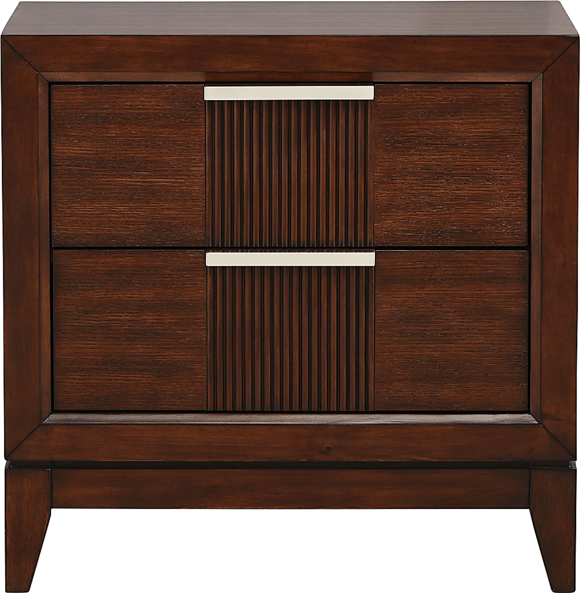 Keep everything you need close at hand with the Bellante two drawer nightstand. Crafted of pine solids and oak veneers in a brown finish, this piece is an attractive and convenient addition to your bedroom. Two drawers with brushed nickel finished hardware and reeded detail down the middle provide handy storage and great looks.