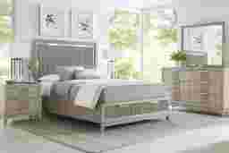Create a stylish new bedroom look with the Bellante panel bedroom set with storage. The chic, contemporary bed and accompanying pieces feature durable pine construction with beautiful oak veneers in a gray color that work wonderfully with many different room decor choices. A subtle negative space in the headboard adds depth to the appearance of this bed while reeded detailing adds another bit of complexity to the style of this incredible piece. Two built-in storage drawers in the footboard add to the utility of this bed as a great spot to store bedding, sweaters and more. Mattress and foundation (if required) sold separately.