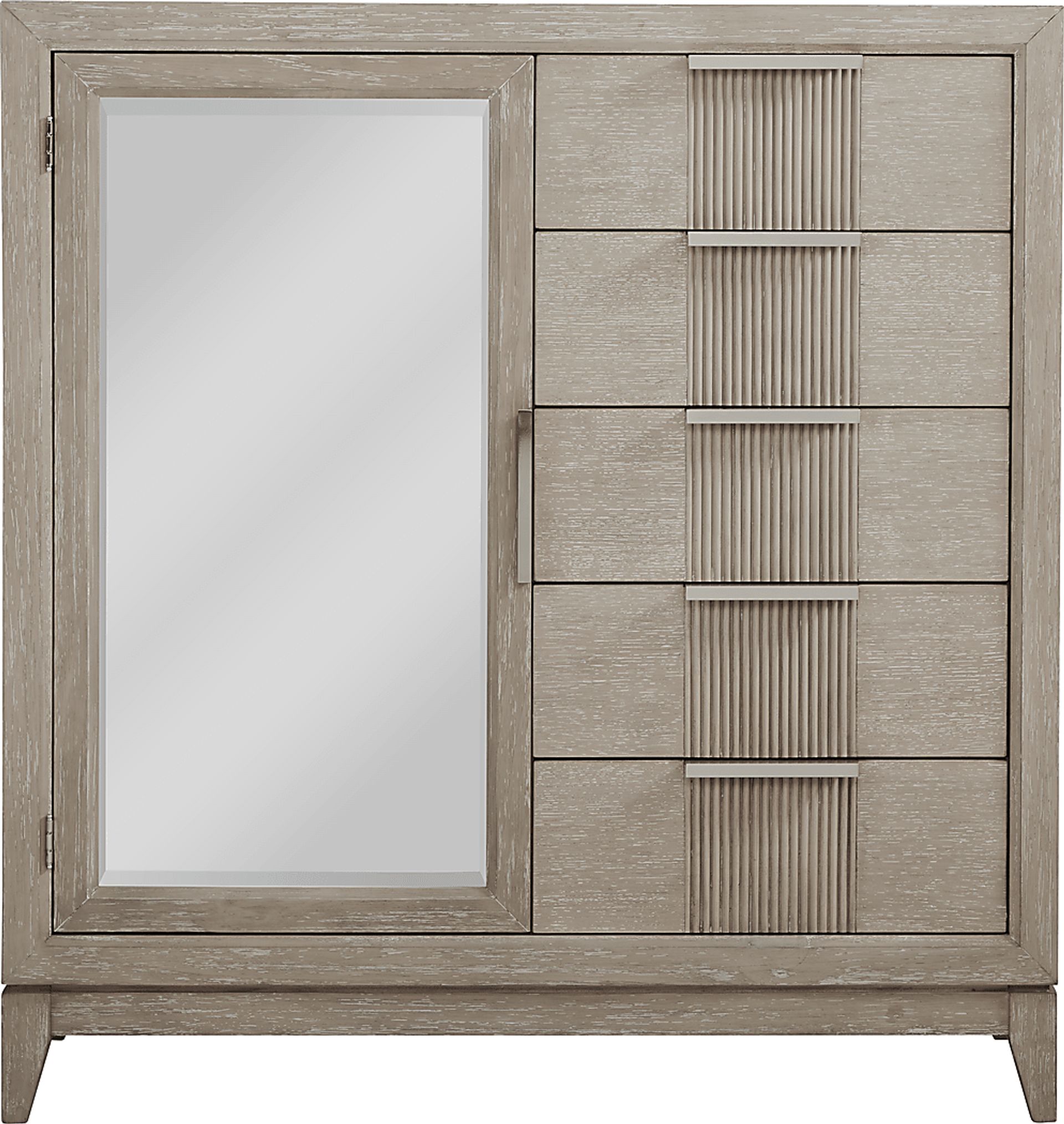 Expand storage options with the useful Bellante bureau. Five vertically arranged drawers consolidate space without sacrificing space to keep your belongings. A cabinet with a mirror front opens up for extra storage. This piece is crafted of pine solids and oak veneers in a beautiful gray finish. Brushed nickel finished hardware and reeded detailing down the center of the drawers complete the look of this contemporary piece.