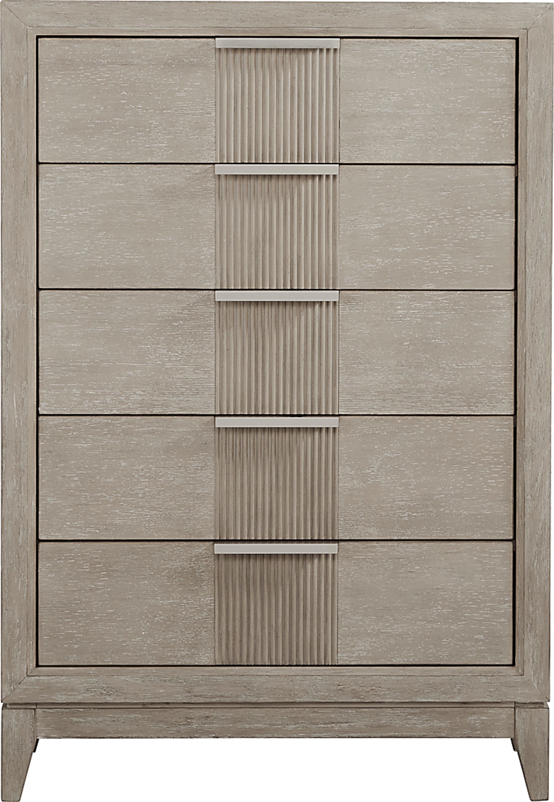 Expand storage options with the useful Bellante chest. Five vertically arranged drawers consolidate space without sacrificing space to keep your belongings. This piece is crafted with oak veneers in a beautiful gray finish. Brushed nickel finished hardware and reeding detail down the center of the drawers complete the look of this contemporary piece.