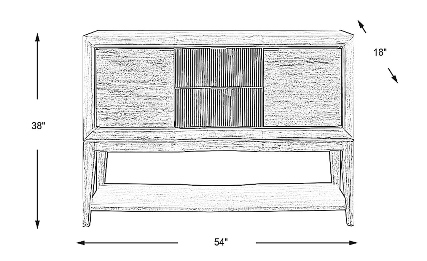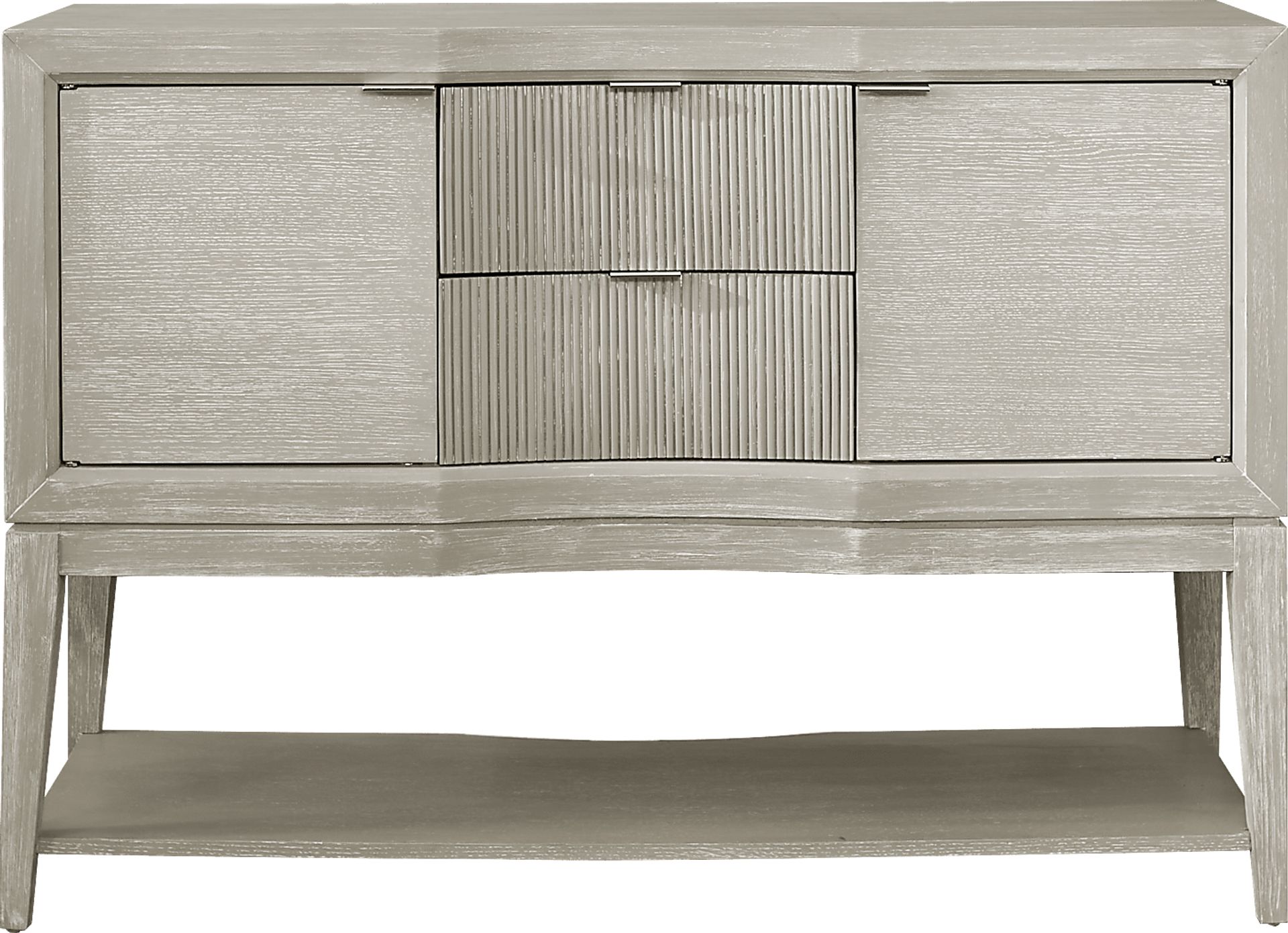 Complete your dining area with the refined Bellante server. This beautiful piece is crafted of pine, poplar and wood solids with oak veneers. Boasting a chic gray finish, the server features a sleek, rectangular frame that's perfect for contemporary spaces. Reeded detailing on the two middle drawers fosters a one-of-a-kind, designer look. Offering customized storage for silverware, plates and more, two doors reveal compartments with an adjustable shelf inside. Slim metal hardware with a silver finish gives it an upscale, modern appearance. Plus, a lower shelf provides additional space to store and display your favorite dining essentials.