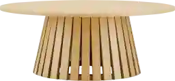A round table is often the preferred shape for L-shaped or U-shaped sectionals. Its symmetrical 35.5-inch footprint ensures that the surface remains accessible from multiple seating positions without blocking the "entry" points of the sectional. The sculptural, slatted base adds a unique textural element that breaks up the solid blocks of fabric typical of large seating arrangements.