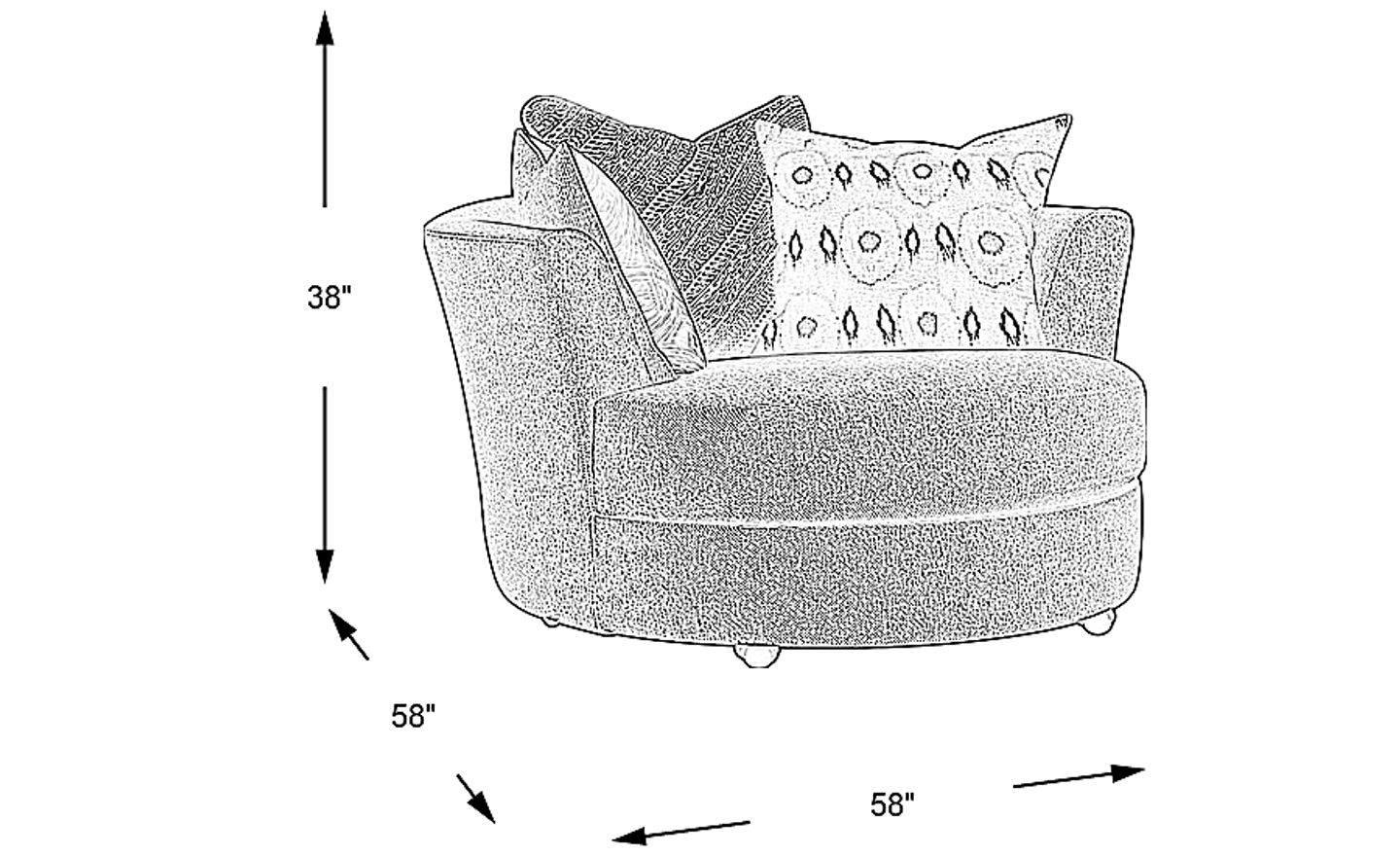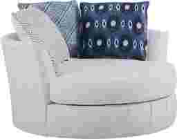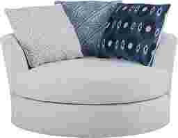 The contemporary Bellehurst swivel chair boasts a highly functional design for your space. Upholstered in textured plush fabric, its off-white hue creates a calming atmosphere. This generously sized chair has rounded track arms that create a sleek, stylish look. Scatterback pillows offer a mix of bold, playful prints in shades of blue. Plus, the convenient swivel feature allows you to rotate effortlessly for ease of comfort. Upholstery: 100% Polyester.