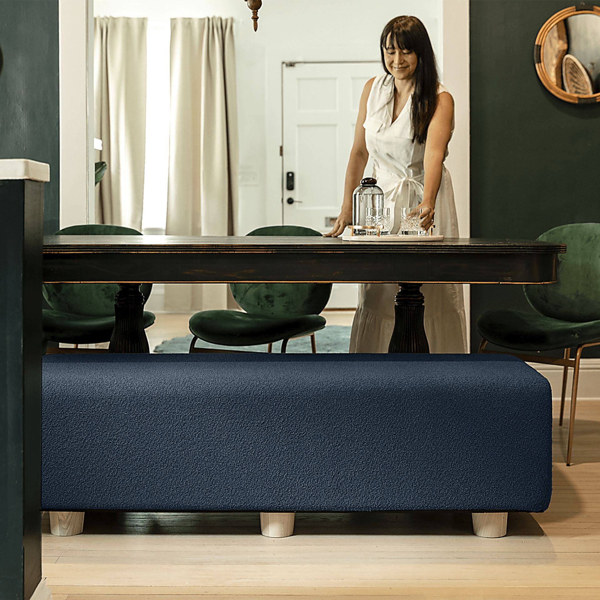 Introducing the Bellemere bed bench - the ultimate multi-functional piece of furniture for your home! Crafted from high-quality materials and designed with versatility in mind, the Bellemere is the perfect addition to any living space. Whether you need a comfortable place to lounge, a stylish accent piece, or a platform for your yoga and massage routines, this bench has got you covered. Expertly constructed in dense foam and covered with premium boucle fabric, this bench boasts a plush, textured surface that feels soft and inviting to the touch. Its neutral color scheme and clean lines ensure that it will seamlessly blend in with any decor style, making it a timeless investment for your home. Six solid, natural maple feet elevate the bench and can be stained, painted, or sealed to accent any decor and provide a sturdy and supportive surface for all your relaxation needs. Customer assembly required.