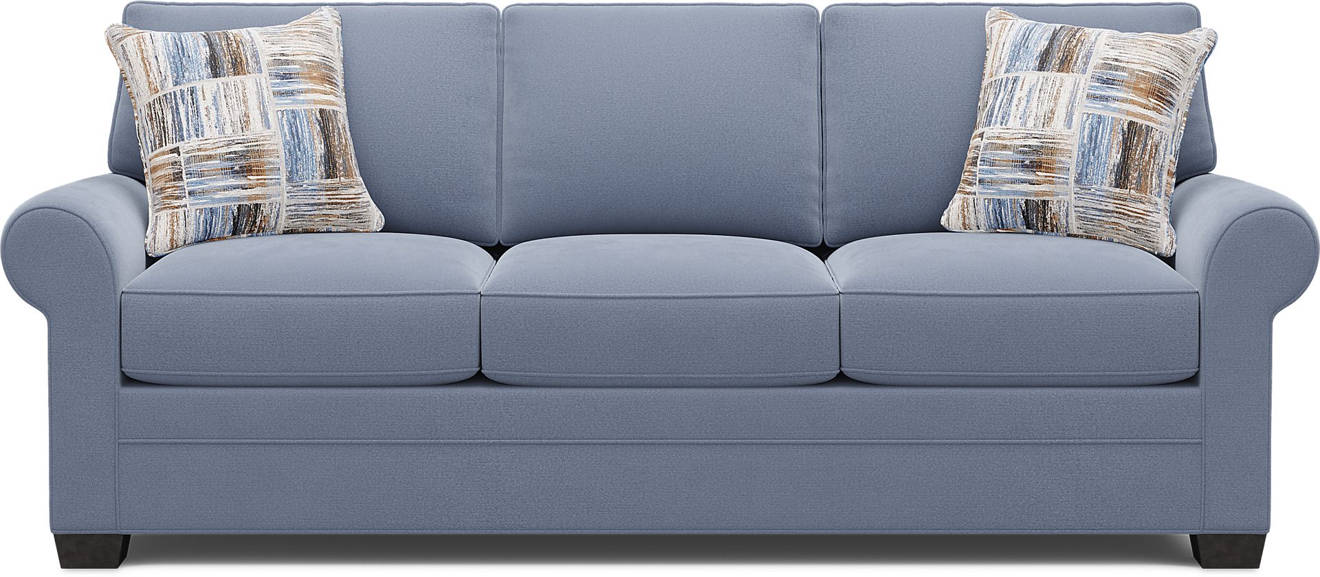Timeless family-style seating is here with the Bellingham sofa from Cindy Crawford Home. Upholstered with soft, herringbone embossed microfiber fabric in an irresistible shade of blue, this piece features reversible back and seat cushions with double-welted boxed borders. Matching accent pillows and padded rolled arms add perfect final touches. 100% Polyester