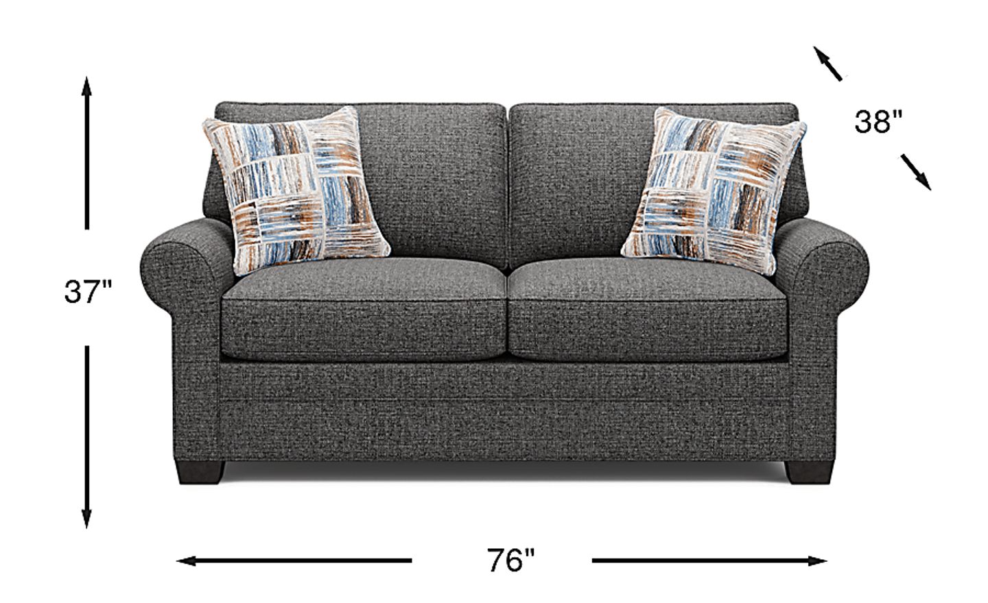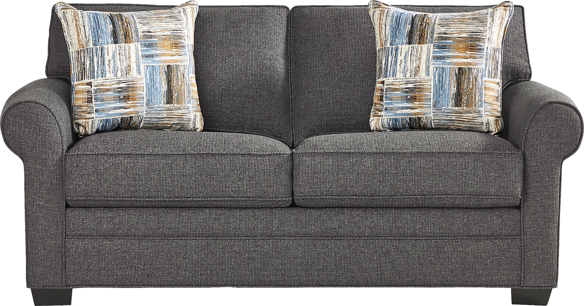 Timeless seating is here with the Bellingham sleeper loveseat from Cindy Crawford Home. Upholstered with textured woven fabric in an irresistible dark granite color, this piece features reversible back and seat cushions with double-welted boxed borders. A full Sealy Royale mattress can be pulled out to create a comfortable guest suite for overnight company. Matching accent pillows and padded rolled arms add perfect final touches. 100% Polypropylene