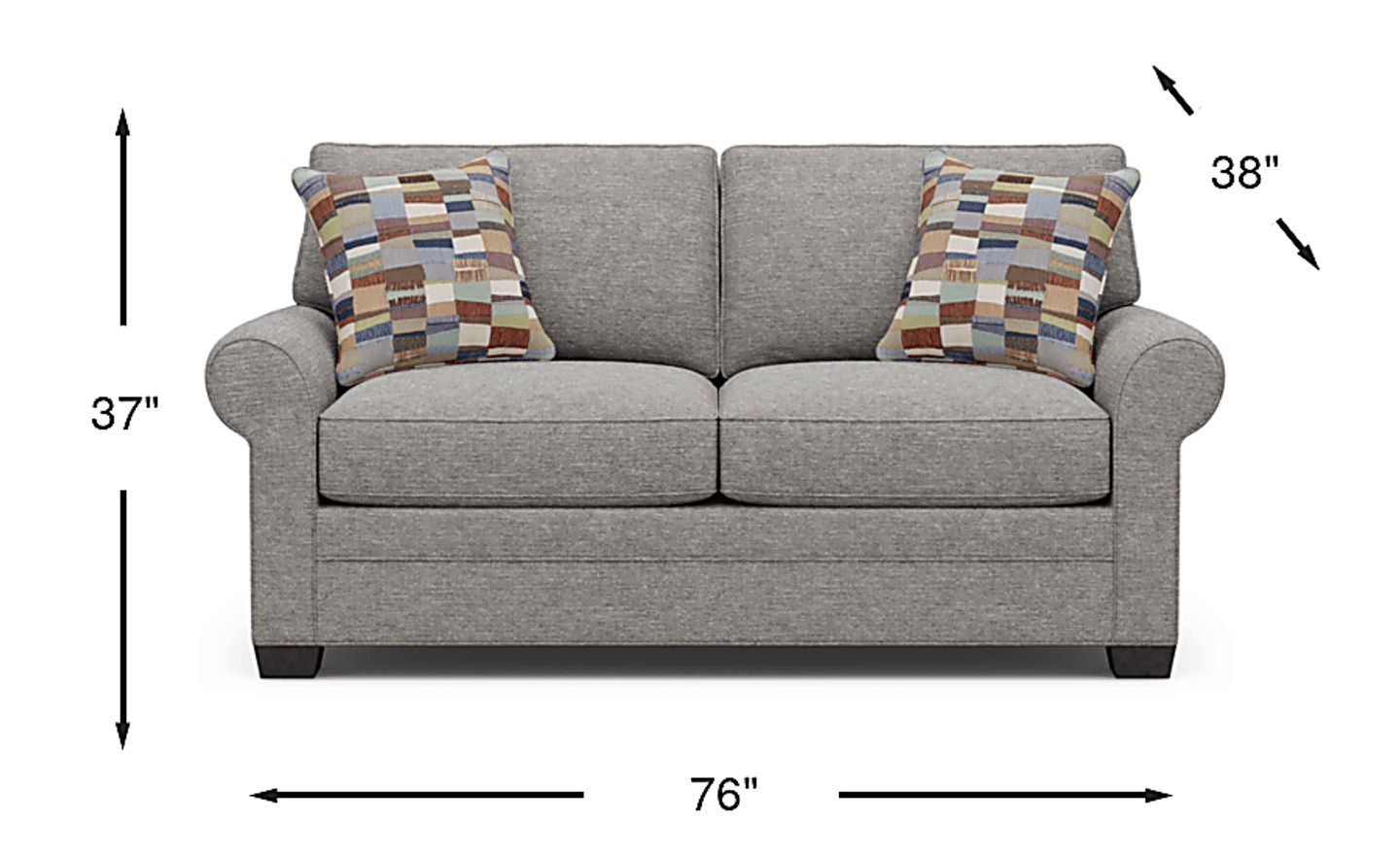 Timeless family-style seating is here with the Bellingham collection from Cindy Crawford Home. Upholstered with textured chenille in an irresistible shade of stone gray, this loveseat features soft curves and padded roll arms for a graceful silhouette. Reversible back and seat cushions with double-welted boxed borders add refined tailoring. Beneath is a Sealy Royale sleeper mattress that easily transforms your living room into a peaceful guest room. A pair of toss pillows showcase a patchwork-inspired design in earthy shades of blue, purple, green and brown to create a warming accent, while fringed textured details bring tactile interest and dimension. Upholstery: 90% Polyester,10% Viscose