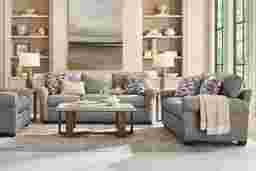 Timeless family-style seating is here with the Bellingham collection from Cindy Crawford Home. Upholstered with textured chenille in an irresistible shade of stone gray, this sofa features soft curves and padded roll arms for a graceful silhouette. Reversible back and seat cushions with double-welted boxed borders add refined tailoring. A pair of toss pillows showcase a patchwork-inspired design in earthy shades of blue, purple, green and brown to create a warming accent, while fringed textured details bring tactile interest and dimension. Upholstery: 90% Polyester,10% Viscose