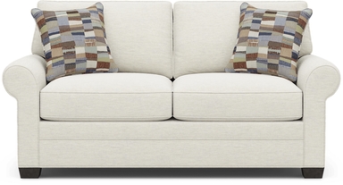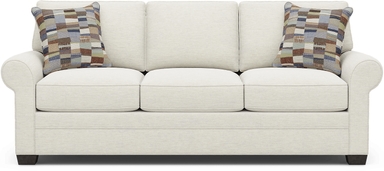 Timeless family-style seating is here with the Bellingham collection from Cindy Crawford Home. Upholstered with textured chenille in an irresistible shade of ivory white, this living room features soft curves and padded roll arms for a graceful silhouette. Reversible back and seat cushions with double-welted boxed borders add refined tailoring. Beneath the sofa cushions is a Sealy Royale sleeper mattress that easily transforms your living room into a peaceful guest room. Toss pillows showcase patchwork-inspired designs in earthy shades of blue, purple, green and brown to create a warming accent, while fringed textured details bring tactile interest and dimension. Upholstery: 100% Polyester. Cleaning Instructions: Use water based cleaning agents or foam. Tables and lamps not as shown in room image. Small accent pillow not included.