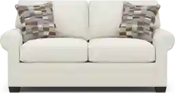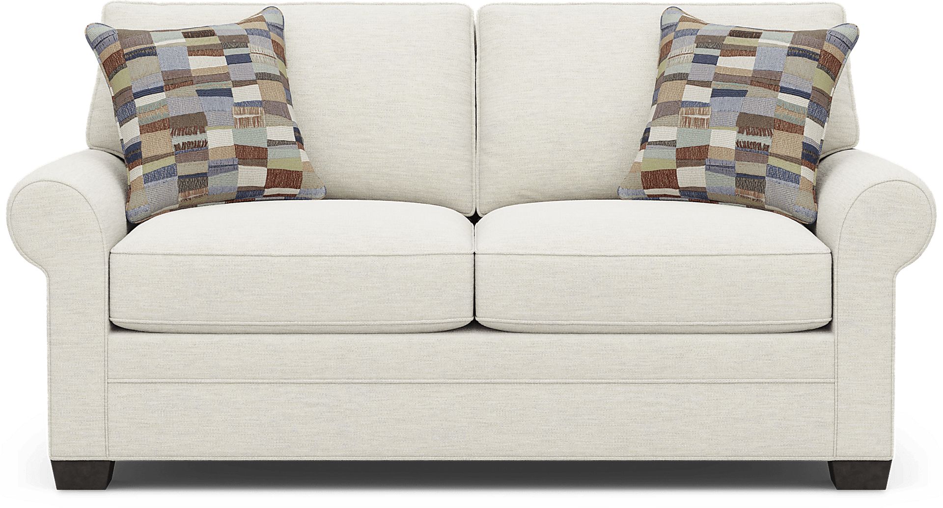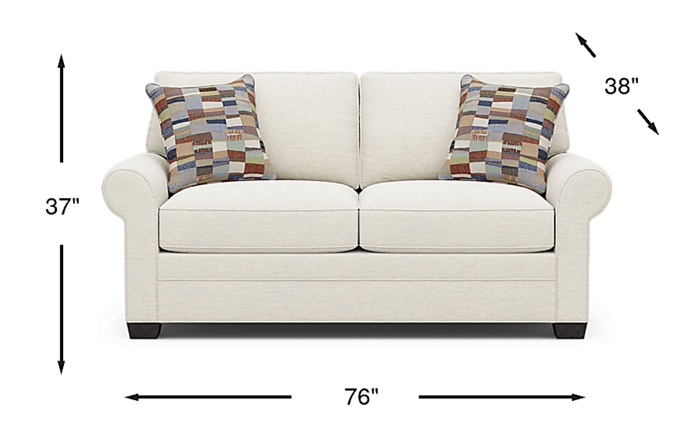 Timeless family-style seating is here with the Bellingham collection from Cindy Crawford Home. Upholstered with textured chenille in an irresistible shade of ivory white, this apartment sofa features soft curves and padded roll arms for a graceful silhouette. Reversible back and seat cushions with double-welted boxed borders add refined tailoring. A pair of toss pillows showcase a patchwork-inspired design in earthy shades of blue, purple, green and brown to create a warming accent, while fringed textured details bring tactile interest and dimension. Upholstery: 90% Polyester,10% Viscose