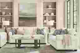 Timeless family-style seating is here with the Bellingham collection from Cindy Crawford Home. Upholstered with textured chenille in an irresistible shade of ivory white, this apartment sofa features soft curves and padded roll arms for a graceful silhouette. Reversible back and seat cushions with double-welted boxed borders add refined tailoring. A pair of toss pillows showcase a patchwork-inspired design in earthy shades of blue, purple, green and brown to create a warming accent, while fringed textured details bring tactile interest and dimension. Upholstery: 90% Polyester,10% Viscose
