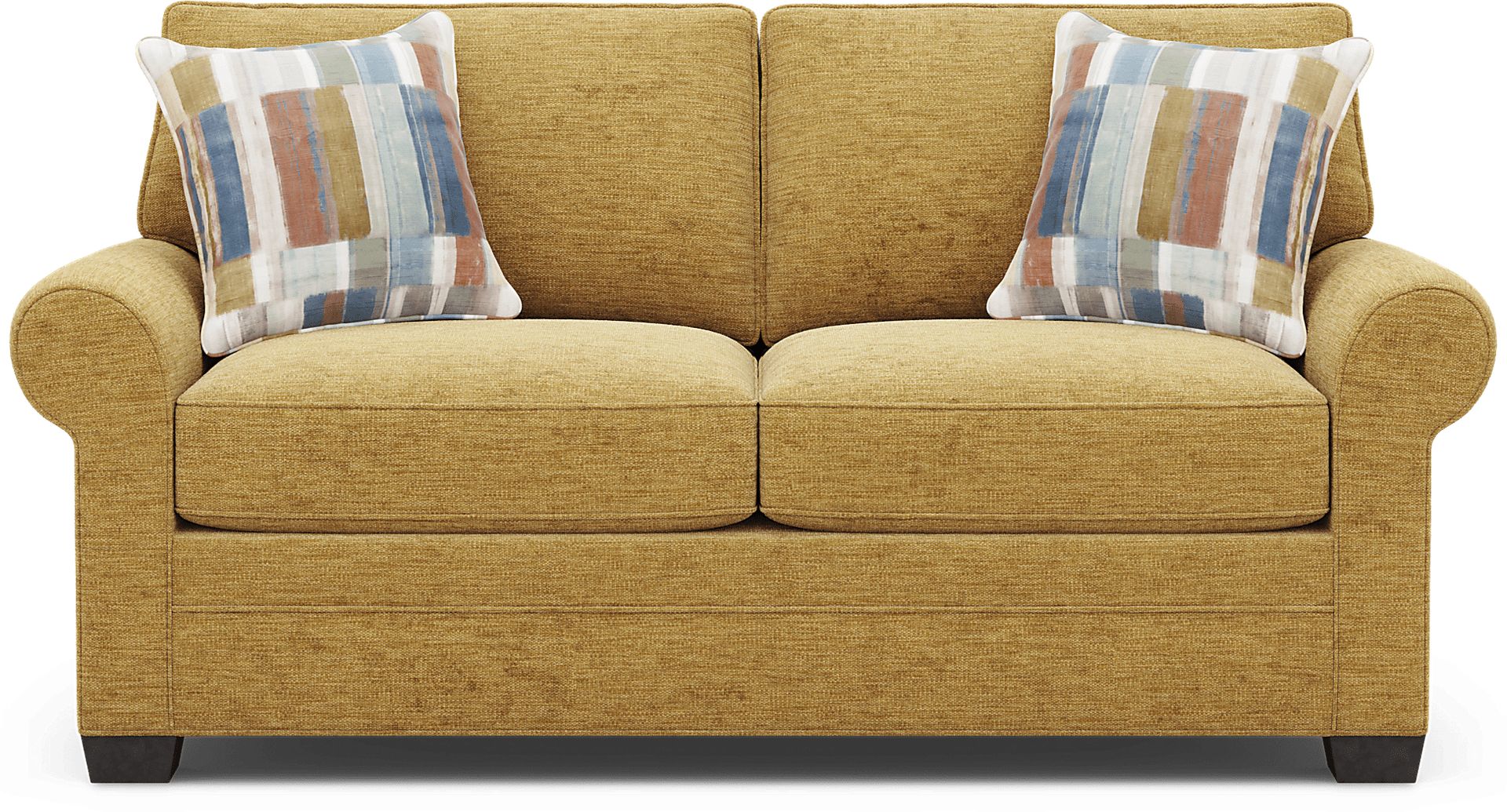Timeless family-style seating is here with the Bellingham collection from Cindy Crawford Home. Upholstered with textured chenille in an irresistible shade of maize yellow, this loveseat features soft curves and padded roll arms for a graceful silhouette. Reversible back and seat cushions with double-welted boxed borders add refined tailoring. Beneath is a full Nature's Bed gel foam sleeper mattress that easily transforms your living room into a cool and comfortable sleep space for overnight guests. A pair of toss pillows showcase a patchwork-inspired design in earthy shades of blue, purple, green and brown to create a warming accent, while fringed textured details bring tactile interest and dimension. Upholstery: 90% Polyester,10% Viscose