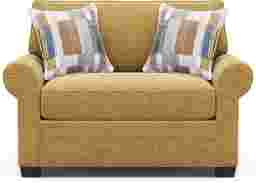 Timeless family-style seating is here with the Bellingham collection from Cindy Crawford Home. Upholstered with textured chenille in an irresistible shade of maize yellow, this chair features soft curves and padded roll arms for a graceful silhouette. Reversible back and seat cushions with double-welted boxed borders add refined tailoring. Beneath is a Sealy Royale sleeper mattress that easily transforms your living room into a peaceful guest room. A pair of toss pillows showcase a patchwork-inspired design in earthy shades of blue, purple, green and brown to create a warming accent, while fringed textured details bring tactile interest and dimension. Upholstery: 90% Polyester,10% Viscose