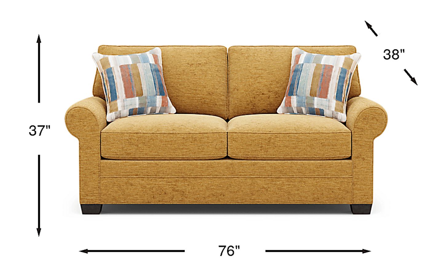Timeless family-style seating is here with the Bellingham collection from Cindy Crawford Home. Upholstered with textured chenille in an irresistible shade of maize yellow, this loveseat features soft curves and padded roll arms for a graceful silhouette. Reversible back and seat cushions with double-welted boxed borders add refined tailoring. Beneath is a full Sealy Royale sleeper mattress that easily transforms your living room into a peaceful guest room. A pair of toss pillows showcase a patchwork-inspired design in earthy shades of blue, purple, green and brown to create a warming accent, while fringed textured details bring tactile interest and dimension. Upholstery: 90% Polyester,10% Viscose