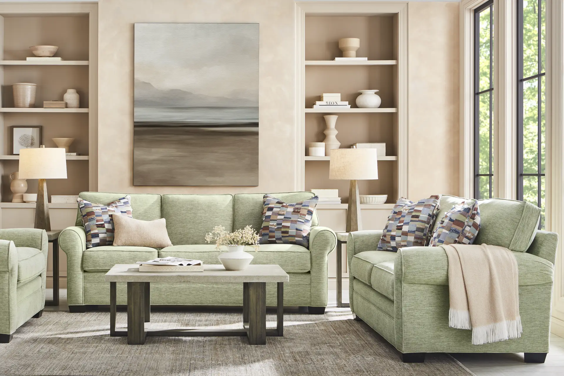 Includes:off-white sofa • maize sleeper loveseat • brown 3 pc occasional table set