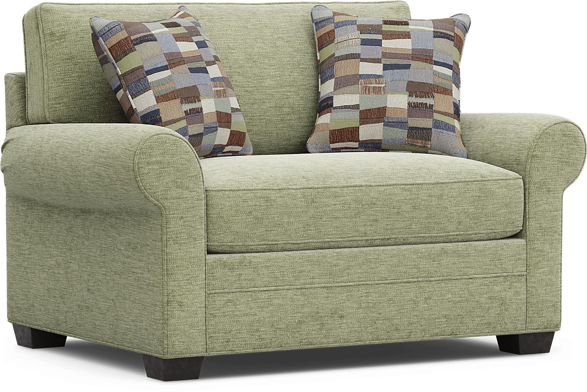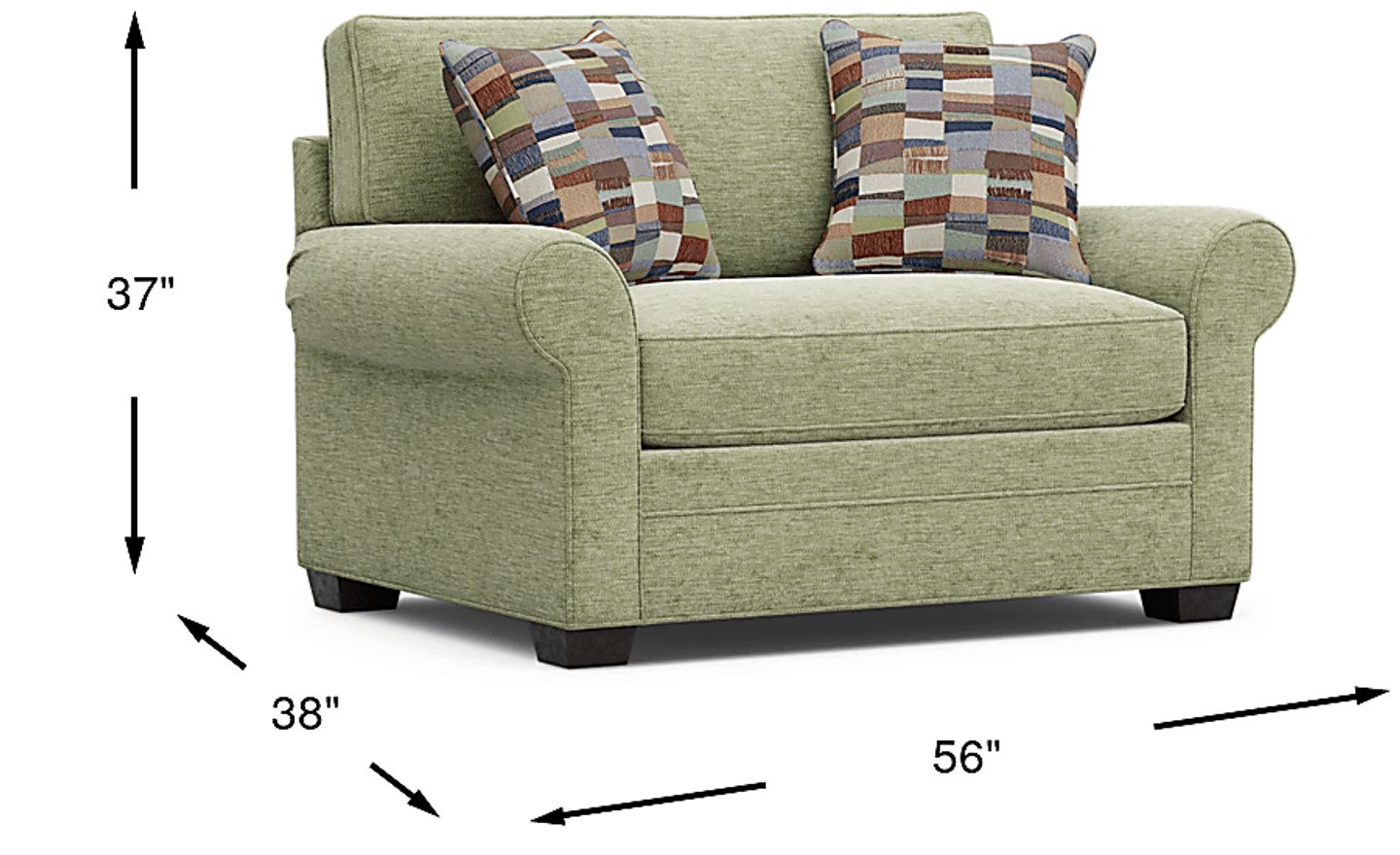 Timeless family-style seating is here with the Bellingham collection from Cindy Crawford Home. Upholstered with textured chenille in an irresistible shade of moss green, this chair features soft curves and padded roll arms for a graceful silhouette. Reversible back and seat cushions with double-welted boxed borders add refined tailoring. A pair of toss pillows showcase a patchwork-inspired design in earthy shades of blue, purple, green and brown to create a warming accent, while fringed textured details bring tactile interest and dimension. Upholstery: 90% Polyester,10% Viscose