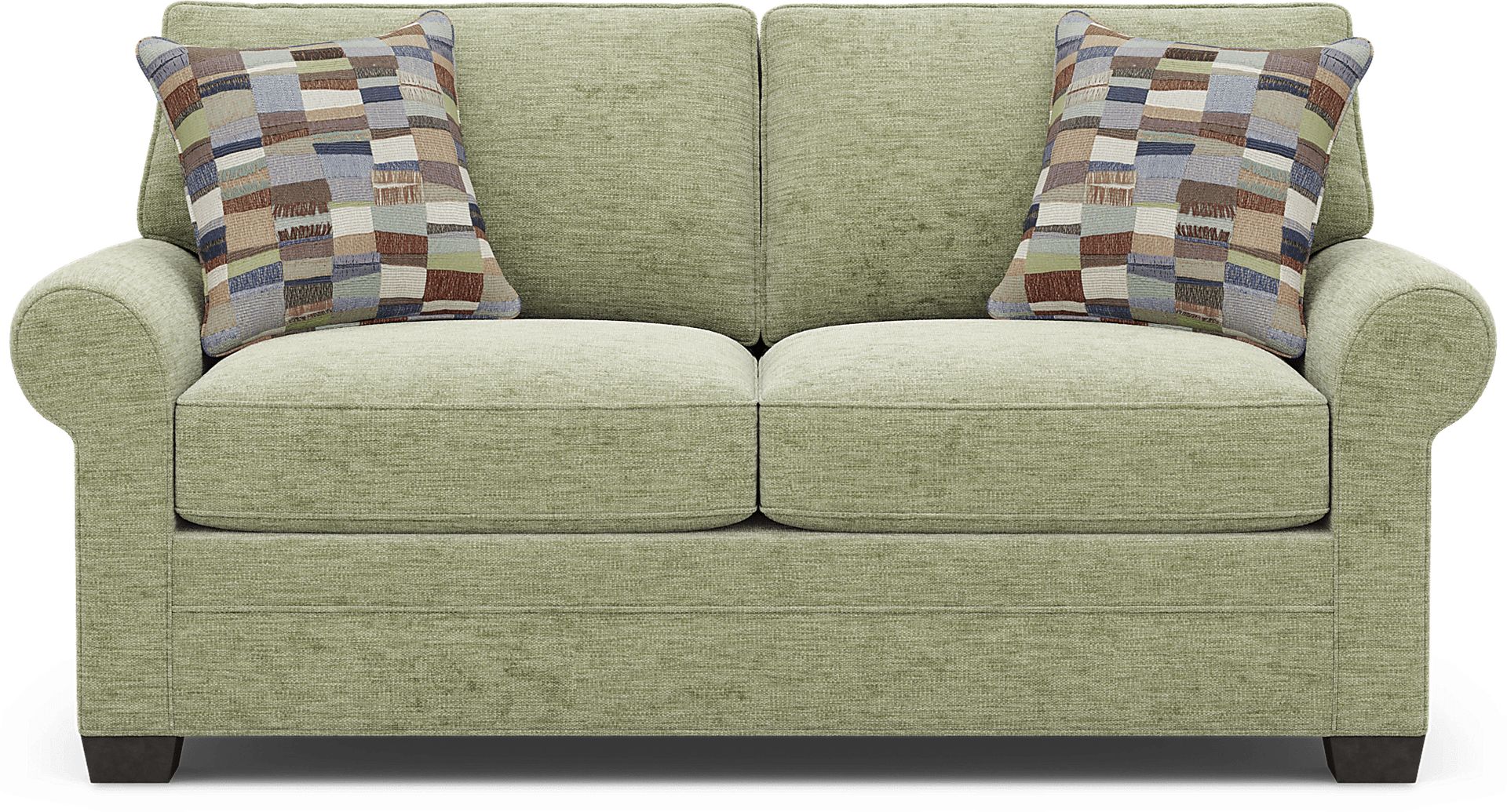 Timeless family-style seating is here with the Bellingham collection from Cindy Crawford Home. Upholstered with textured chenille in an irresistible shade of moss green, this loveseat features soft curves and padded roll arms for a graceful silhouette. Reversible back and seat cushions with double-welted boxed borders add refined tailoring. Beneath is a full Nature's Bed gel foam sleeper mattress that easily transforms your living room into a cool and comfortable sleep space for overnight guests. A pair of toss pillows showcase a patchwork-inspired design in earthy shades of blue, purple, green and brown to create a warming accent, while fringed textured details bring tactile interest and dimension. Upholstery: 90% Polyester,10% Viscose