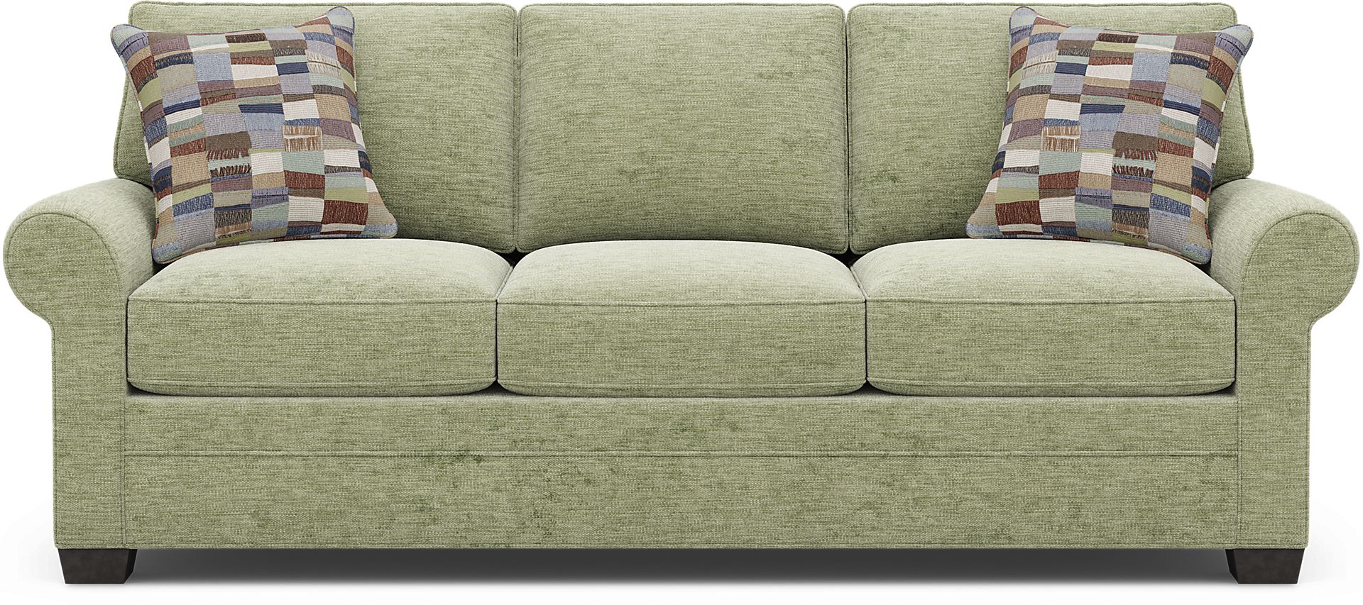 Timeless family-style seating is here with the Bellingham collection from Cindy Crawford Home. Upholstered with textured chenille in an irresistible shade of moss green, this sofa features soft curves and padded roll arms for a graceful silhouette. Reversible back and seat cushions with double-welted boxed borders add refined tailoring. Beneath is a Sealy Royale sleeper mattress that easily transforms your living room into a peaceful guest room. A pair of toss pillows showcase a patchwork-inspired design in earthy shades of blue, purple, green and brown to create a warming accent, while fringed textured details bring tactile interest and dimension. Upholstery: 90% Polyester,10% Viscose