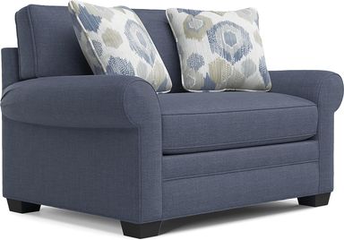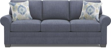 Timeless family-style seating is here with the Bellingham living room from Cindy Crawford Home. Upholstered with textured chenille in an irresistible shade of sapphire blue, the sofa and loveseat each feature reversible back and seat cushions with double-welted boxed borders. The sleeper sofa features a queen size Sealy Royale mattress that can be pulled out to create a comfortable guest suite for overnight company. Matching accent pillows and padded rolled arms add perfect final touches. Upholstery: 100% Polyester. Cleaning Instructions: Use water based cleaning agents or foam. Accent pillows not included. Tables and lamps not as shown in room image.