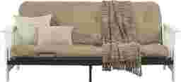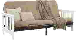 The Bellwood futon is not only a trendy place to sit, but an excellent spot for relaxing or lounging. Simply open the spring loaded hinge to fold out the sofa into a full sized foam bed (sold separately), perfect for an unexpected guest or sleepovers. A slim profile constructed from wood solids in a white finish features vertical slat lines for a sleek contemporary look. Its compact size makes it a great addition to any guest room, small apartment, or even a dorm room. Futon mattress sold separately. Accent pillows and blanket not included. Customer assembly required.