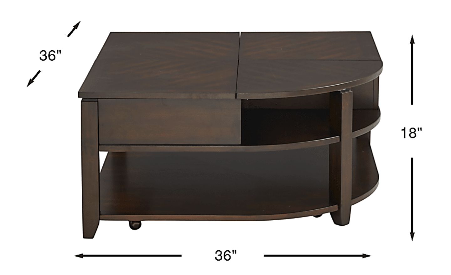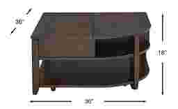 Offering transitional versatility, the Belman cocktail table is designed with your needs in mind. Crafted of wood solids with birch veneers in a rich chocolate brown finish, this unique table features two lift top panels on the tabletop, ideal for eating meals or for use as a writing surface. Built-in open cubbies and a large lower shelf add useful storage space, while caster wheels make it easy to move around as needed. The unique shape of this table, with one curved corner, makes this stylish cocktail table stand apart from the rest. Customer assembly required.