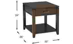 Convenience meets chicness in the stylish Belman end table. Crafted of wood solids with birch veneers in a rich chocolate brown finish, this transitional end table features a storage drawer, adorned with an antique brass finished pull, and a lower shelf. A lift-top panel on the back of the tabletop reveals additional storage space and a built-in power strip with two outlets and USB ports. Customer assembly required.