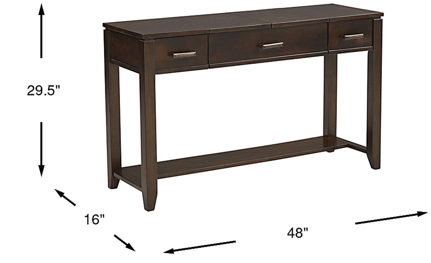 Offering chic transitional style packed with convenient features, the Belman sofa table keeps you organized while looking stylish. Crafted of wood solids with birch veneers in a rich chocolate brown finish, this sofa table features two small drawers and a large storage compartment with a slide-out tray, flip-down front panel and flip-top surface. The center storage compartment also includes a built-in power strip with two outlets and USB ports, as well as wire management holes on the back panel. Antique brass finished hardware completes the stylish look of this versatile piece. Customer assembly required.