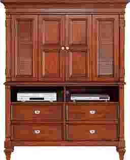 Wonderfully proportioned, detailed, and enhanced with a dark pine finish, the Belmar media armoire is the perfect piece to complete your bedroom. Double doors are highlighted with shuttered panels and raised panel details; hinges with a "wrap around" feature provides unobstructed TV viewing. Two open shelves for media components are positioned above four storage drawers. Brushed nickel finished hardware provides a beautiful finishing touch. Belmar Dark Pine 2 Pc Media Chest