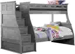 The Belmar bunk bed offers great space saving solutions. The full sized bed on the bottom is connected to the twin top bed by steps with built-in storage drawers. For safety each step has a textured strip for slip resistance. Quality crafted of durable hardwood solids and veneers with a gray finish, the bunk's sides are detailed with shuttered panels. Mattresses and foundations (if required) sold separately. Bunkies required for mattress support.